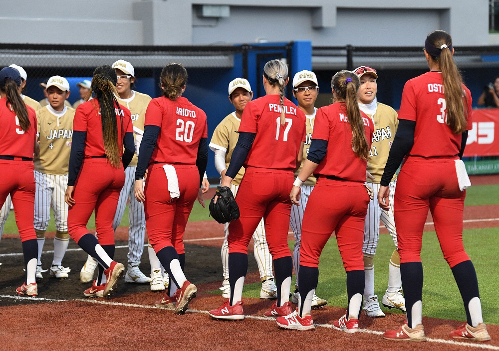 [アメリカ] モニカ・アボット、キャット・オスターマン ー オーブリー・ムンロ、デジャ・ムリポラ [日本] 尾﨑望良、上野由岐子 ー 我妻悠香、清原奈侑、我妻悠香本塁打