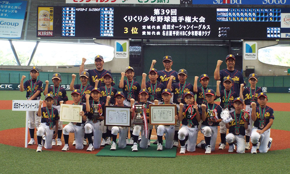 第39回くりくり少年野球大会(毎日新聞社、くりくり軟式少年野球連合会主催、西武鉄道株式会社、株式会社TBSテレビ、スポーツニッポン新聞社、公益財団法人全日本軟式野球連盟後援、ナガセケンコー株式会社、千株式会社、株式会社フジオ・プロダクション協力)が7月28日(金)〜31日(月)、メットライフドームで行われ、千葉代表・打瀬ベイバスターズが優勝しました。