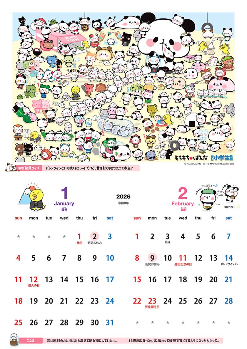 毎日小学生新聞の人気キャラクター「なるほドリ」と人気連載「もちもち♥ぱんだ」がコラボしたキャンペーン限定カレンダーです。ためになる「学びクイズ」付き。お申し込みの方全員にプレゼントします。