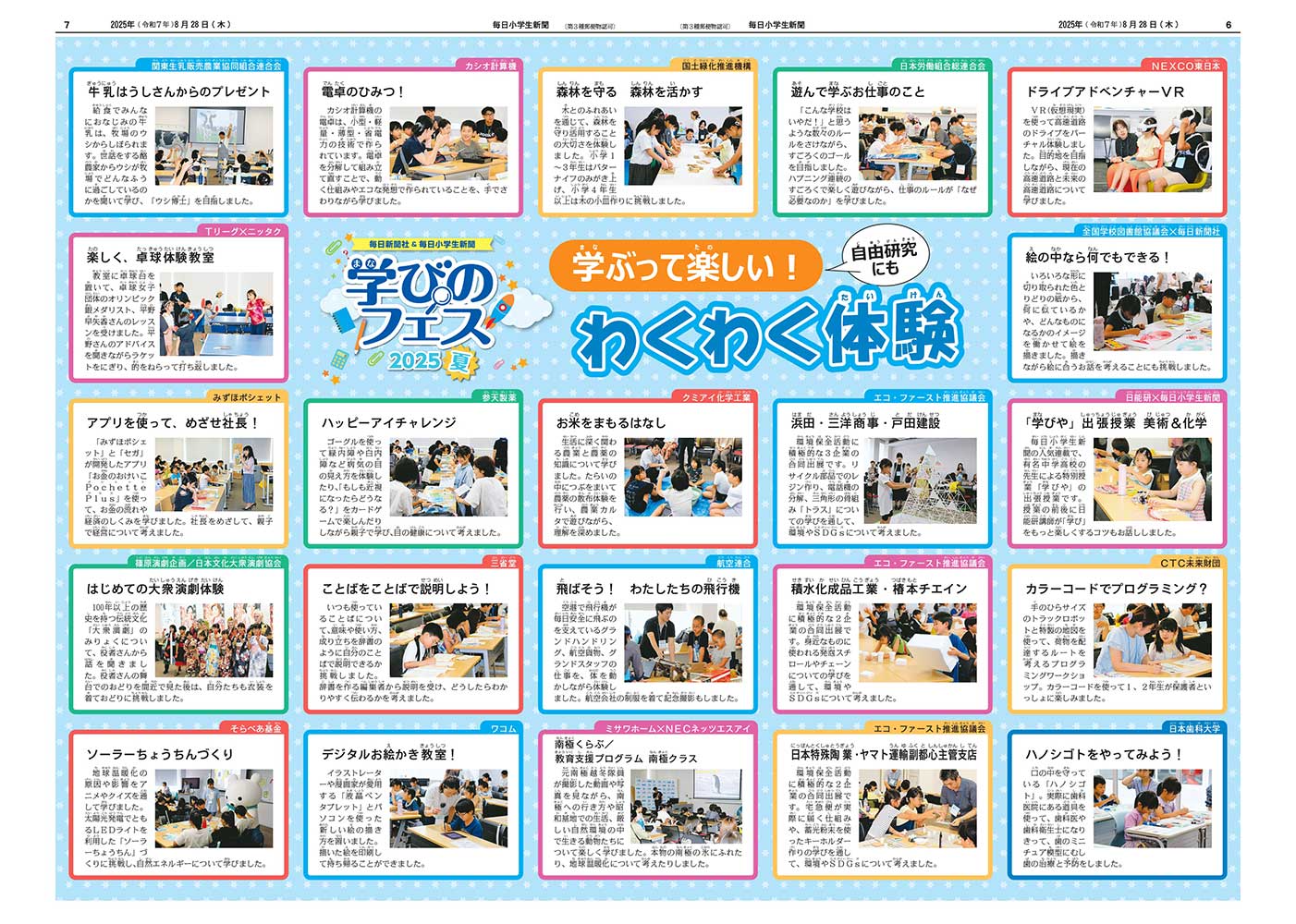 「学びのフェス」とは、企業・団体の小学生向け出前授業を一堂に集めたイベントで、毎年春休みと夏休みに毎日新聞社及び毎日小学生新聞が主催しています。(コロナ禍の2020年と2021年を除く)