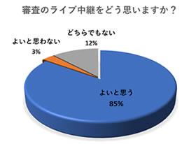 第33回国際高校生選抜書展(書の甲子園)実行委員会と毎日書道会は、同展で初めて実施した審査のインターネットライブ中継の是非などを尋ねるアンケートを実施しました。同展への出品団体(高校・書道教室)に調査への協力を求めたところ、68団体から回答があり、85%(58団体)がライブ中継は「よいと思う」と答えました。「よくないと思う」は3%(2団体)、「どちらでもない」は12%(8団体)でした。