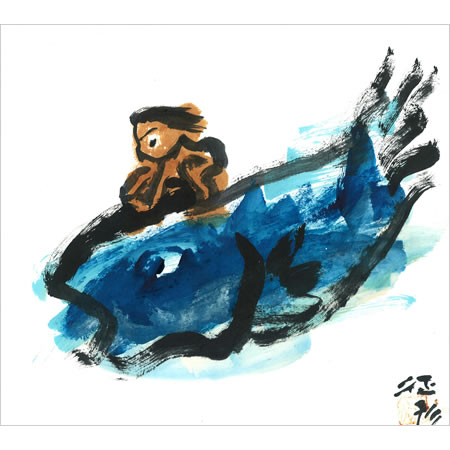 色紙「魚に乗った少年」
