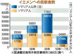 移民は夜を待ち、小舟で出航する。昨年の密航者は約7万8000人。4割がソマリア人、残りの大半がエチオピア人だ。別の移民集団の中でエチオピア人のアッバースさん(25)は「雨が降らず、収穫がない。密航費用は妻と2人で500ドル。危険は承知の上だ」と話した。昨年の渡航途中の死者・行方不明者は376人。イエメンの海岸には、次々に遺体が流れ着くという。