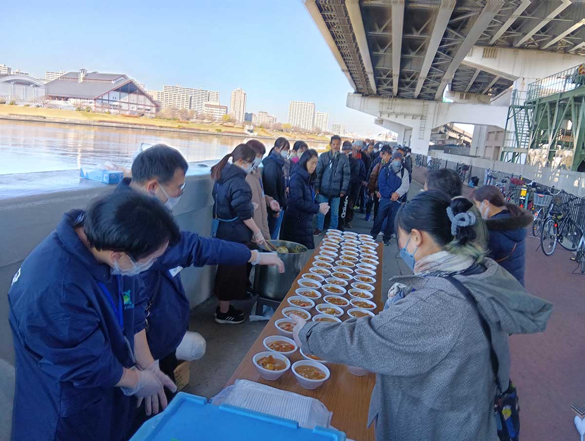 歳末助け合い事業では、生活困窮者や路上生活者への支援を続けています。東京都台東区の山谷地区を中心に活動する「自立支援センターふるさとの会」「山谷兄弟の家伝道所まりや食堂」「きぼうのいえ」「山友会」「友愛会」「あじいる(旧・隅田川医療相談会)」、池袋を中心に活動する「TENOHASI」、横浜に拠点を置く「市民の会 寿アルク」、新宿で支援活動を行う「新宿ごはんプラス」の9団体に助成金を贈呈しました。ウクライナ紛争や中東情勢によるエネルギーの高騰や物価上昇の影響で、生活困窮者や路上生活者の生活はますます苦しくなっています。
