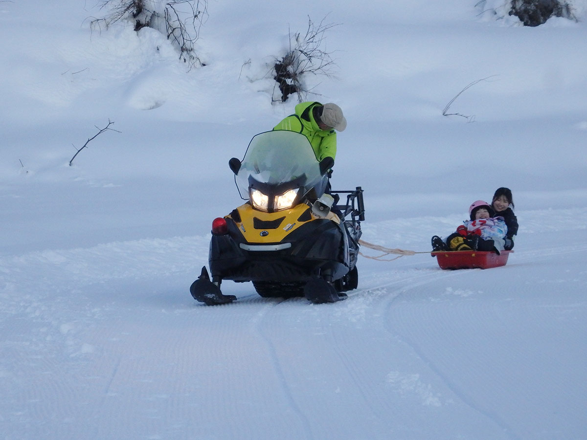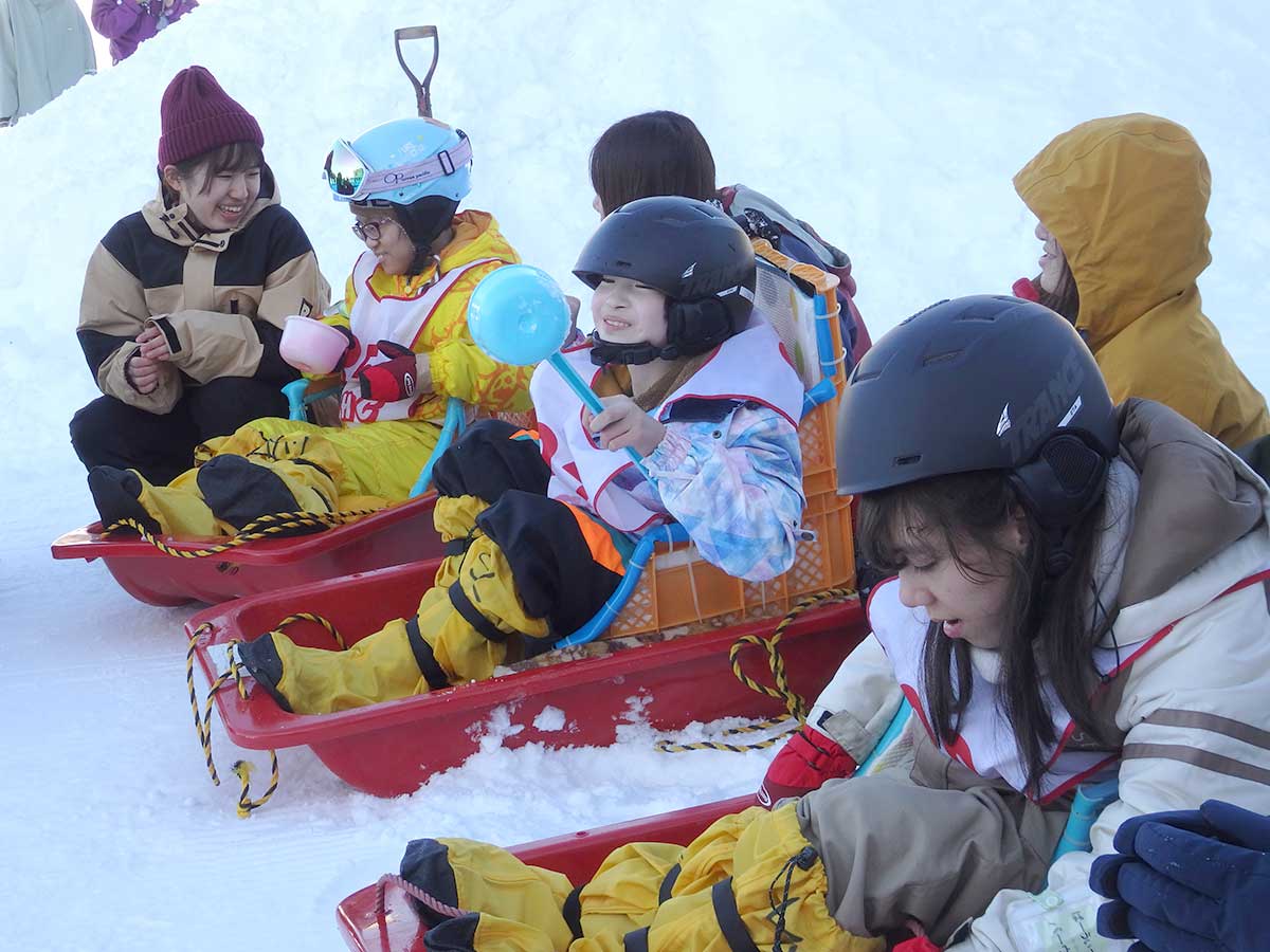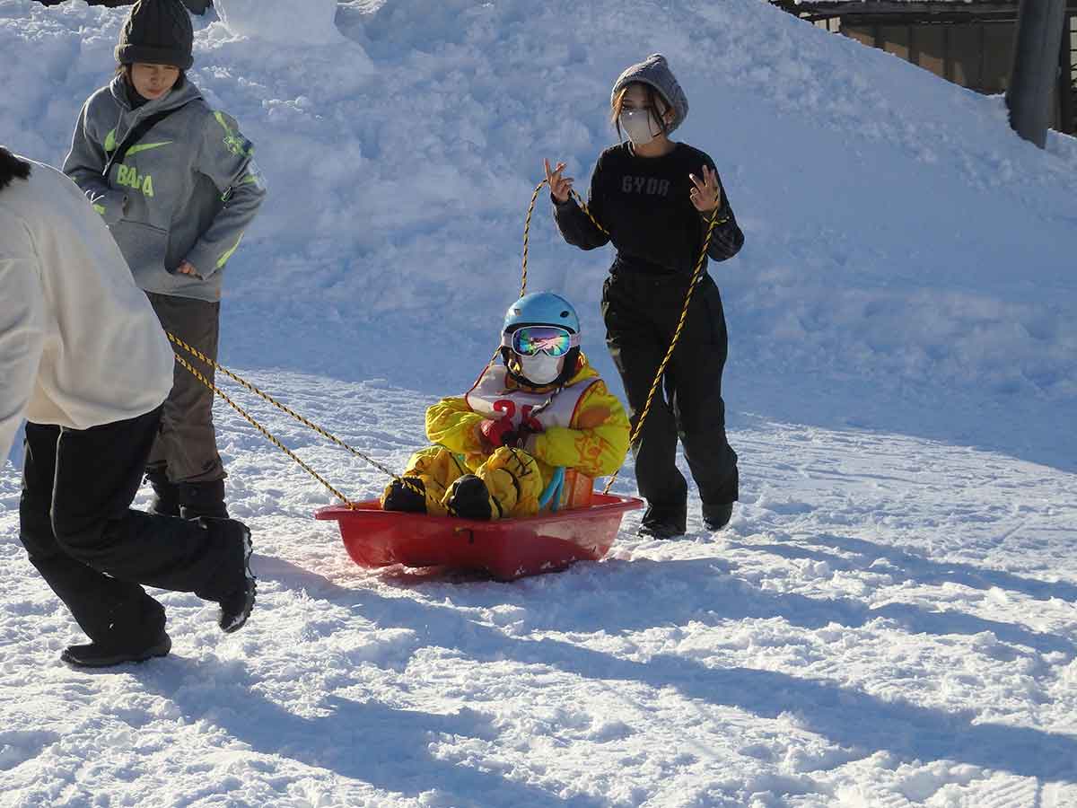 年末から連日のように降り続いた雪で、八海山麓スキー場ゲレンデの積雪は約120センチ。一面の銀世界のなか、子どもたちは大学生や社会人のボランティアたちと一緒にそり遊びを楽しみ、雪の上を転げ回ります。