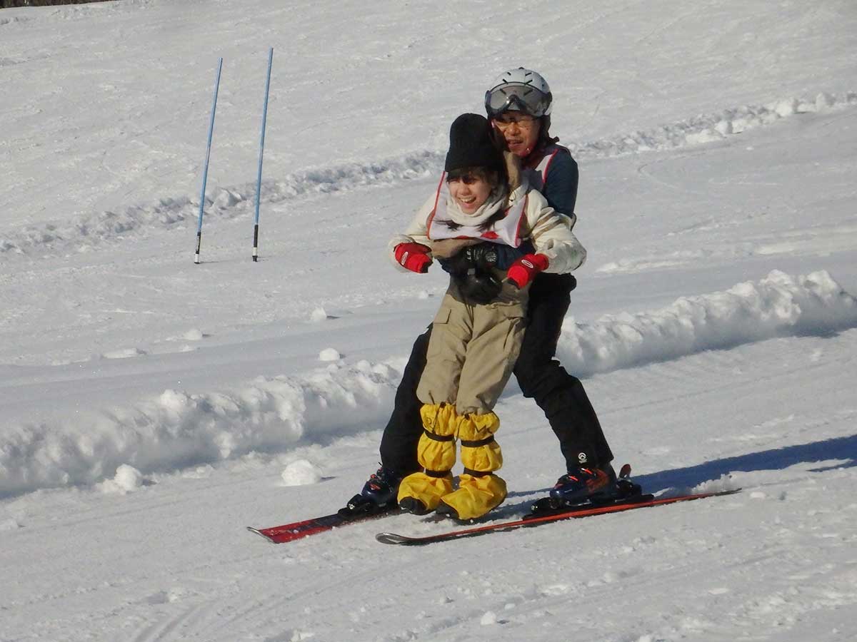 スキー板が2本ある、座位のまま滑れるバイスキーも経験。ベテランのスキーヤーによる「抱っこスキー」や、スノーモービルにも乗せてもらいました。