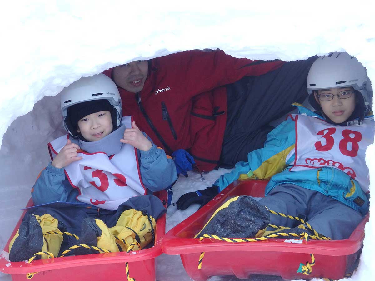 ゲレンデの平地では、子どもたちがバケツに雪をつめて積み上げたり、雪の上で転がったりして、雪遊びを楽しみます。かまくらも作りました。