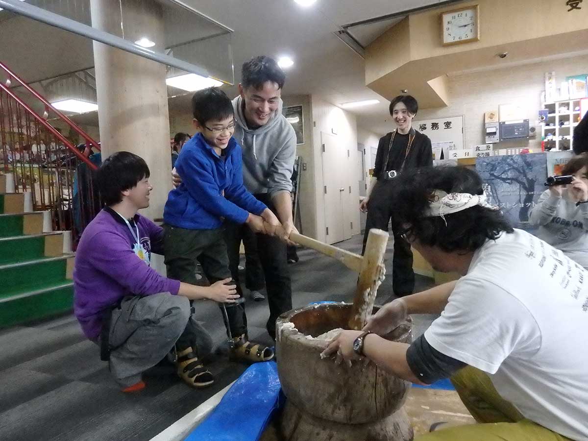 子どもたちは初めての餅つきに挑戦。きねを持って、うすのおもちをぺったん、ぺったん、ぺったん、ぺったん。保護者と一緒になって大喜びです。つきたてのお餅は、あんこや大根おろし、砂糖醤油のアンにまぶしておいしくいただきました。また、サイクリングターミナルのキッチンでつくった豚汁は、熱々のおわんから真っ白な湯気。おいしそうにほおばっていました。