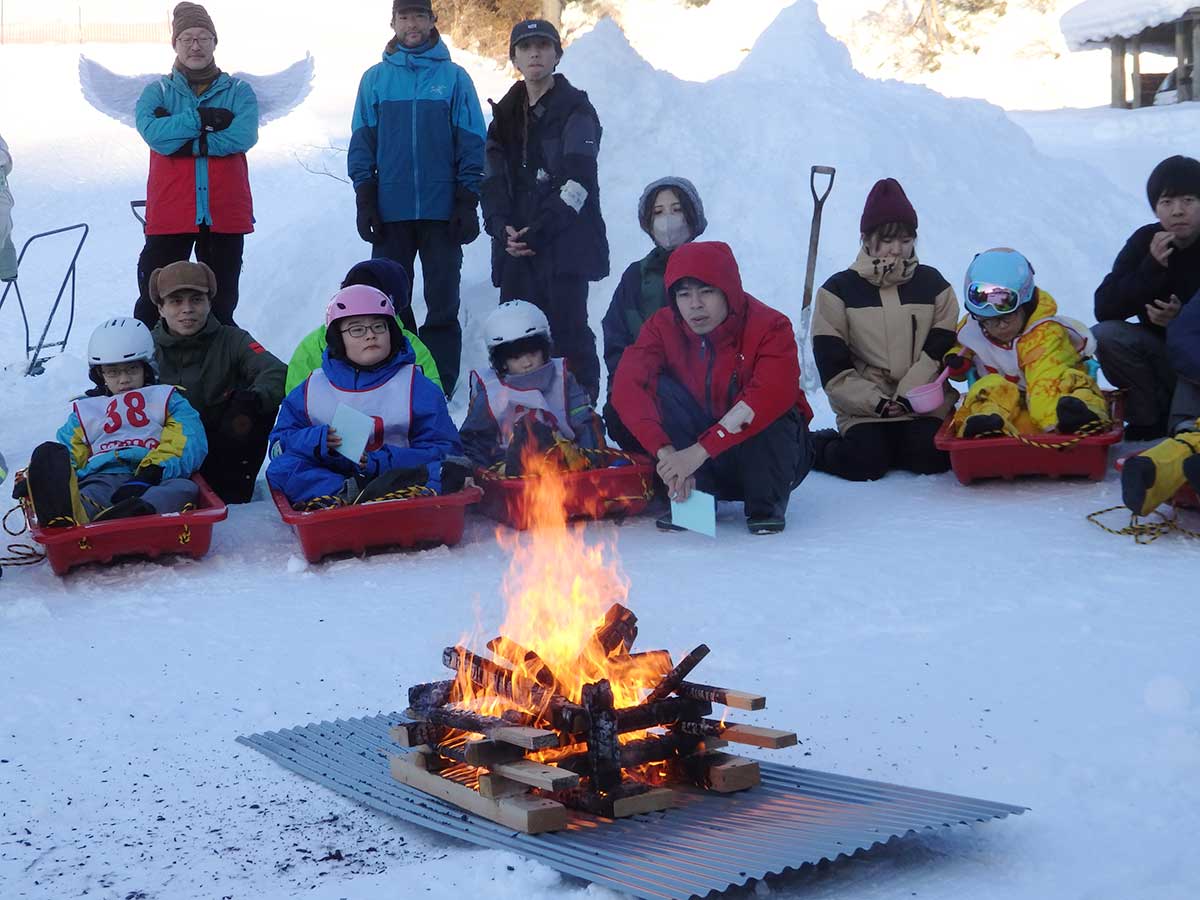 雪上でのキャンプファイアーも感動的でした。「火の神」が点火すると、炎は一気に燃え上がります。夕暮れ空の下、オレンジ色の炎がゆらめくなか、覚えたてのキャンプソングを大きな声で歌いました。