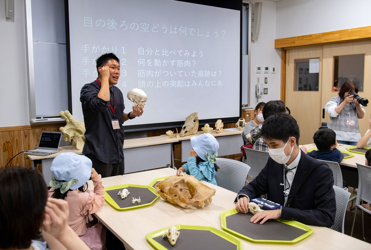 目をつぶって動物の骨を触り、どんな動物かを当てる体験。手で触れることで見えてくる いのちがあります。